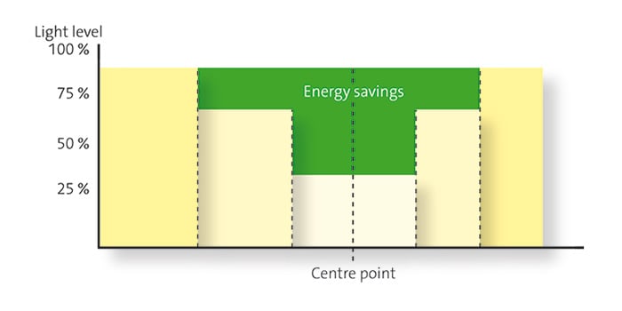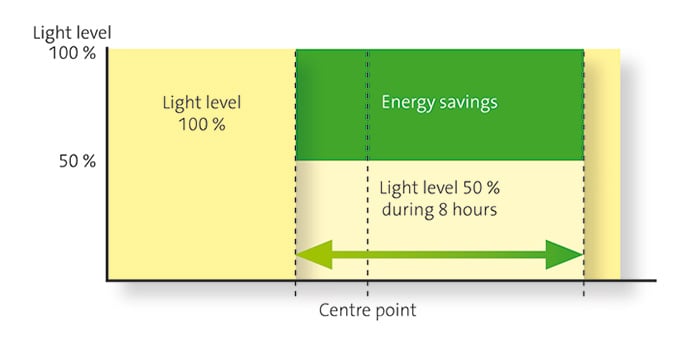 The system calculates the light cycle’s centre point when the installation is on, and then adjusts down from 100 percent to 50 percent over six hours from this centre point. When six hours have passed, the installation is adjusted back up to full level. This can result in energy savings of up to 20 percent.