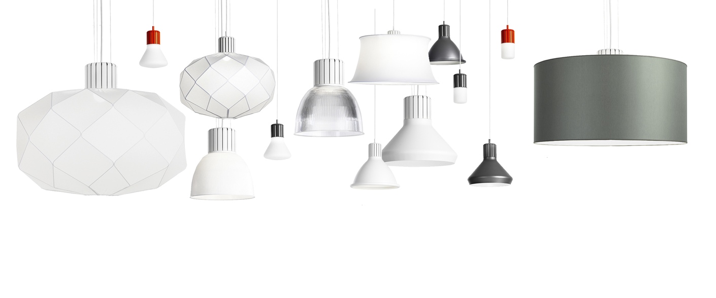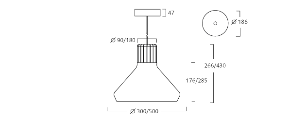 Ø 500 – supplied with 4,0 m white fabric cord 5x0,75 mm², 4,0 m wire suspension with friction locks for height adjustment and white, plastic ceiling cup.