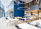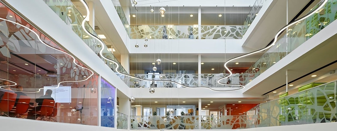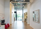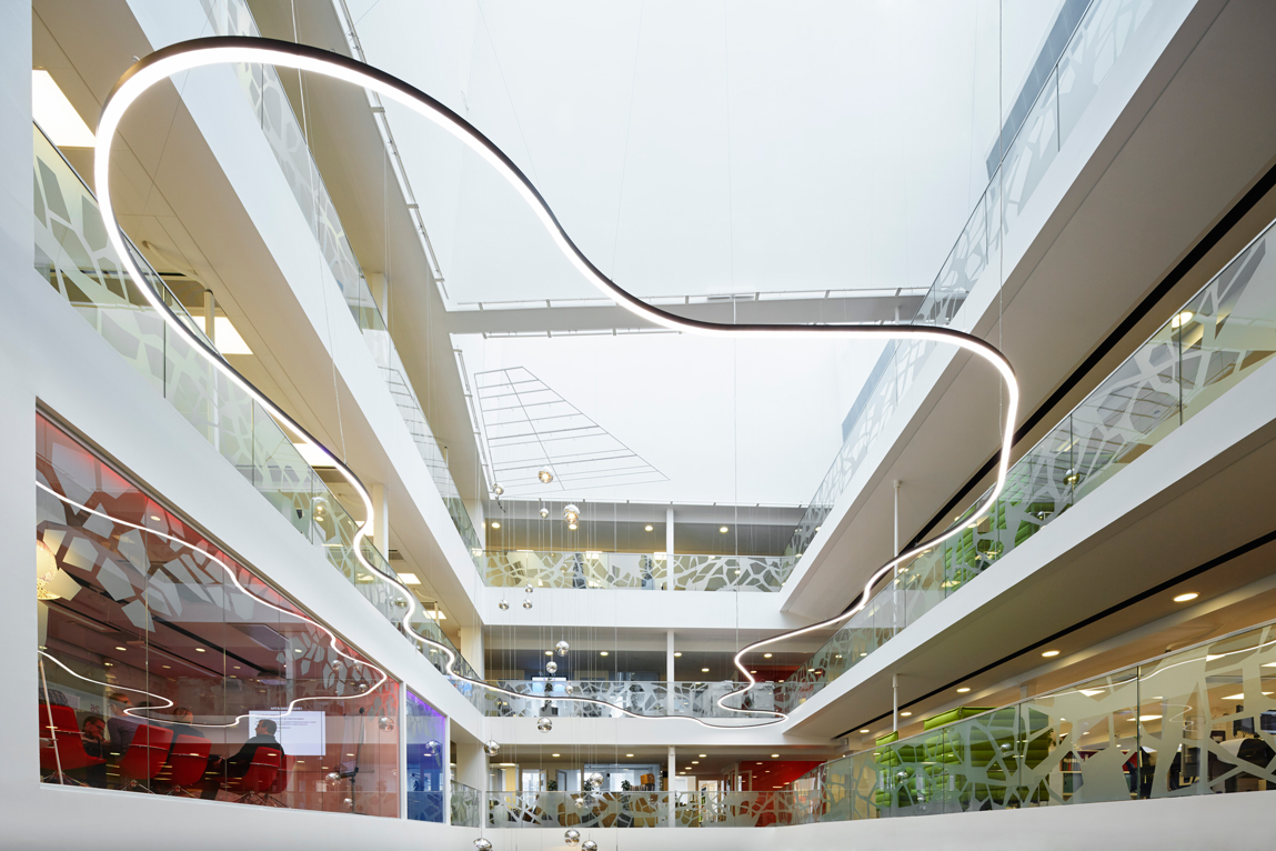 The modules are based on two thin but very sturdy aluminium sections, one of which is bent along a radius of 1200 mm. Using a mixture of straight and curved luminaire modules, combinations can be built where the only limitation is the size of the room. The modules are designed for three different mounting options – suspended, surface or wall mounted– which adds yet another dimension. Particular attention was paid towards toning down the technical solutions for the benefit of aesthetics, with discreet connections between the modules and terminating end-caps. Following the same ambition, the power supply has been made more efficient so that one power feed covers up to six modules. Each wire is capable of carrying multiple modules, which contributes to an even purer expression when the luminaire is suspended.
