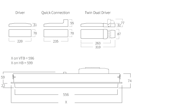 Connection in separate ballast box. Snap-in terminal block 3x1,5 mm² (x2), through-wiring possible. 5x1,5 mm² (x2) when dimming. Can also be supplied with mains cable and earthed plug or chassis mounted snap-in connector. The luminaire housing and driver are connected via a Quick Connection System.