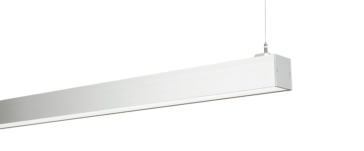 Body lacquered in white (RAL 9016 G40) or black (RAL 9005 G30). Indirect light is covered by an opal film that generates a broad beam and serves as a dust cover. End caps are included in the luminaire.