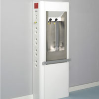 18168 Aluflex Dialysis 18168Due to its constant recurrence, blood dialysis is a laborious process for patients. The design of Alu- flex dialysis system focuses on the comfort or the patient while simplifying the treatment, fading the technology into the background for a more pleasant care environment. The vertical installation is completely free from the walls and the dialysis columns can be placed anywhere in the room. In between window, or back to back this flexibility enable’s the staff to work freely over the surfaces. Space in the dialysis column has been provided for wiring and electrical outlet sockets, pipes and connection to medical gases, while the vertical connection has also enabled the integration of pipes and taps for dialysis water and drainage.