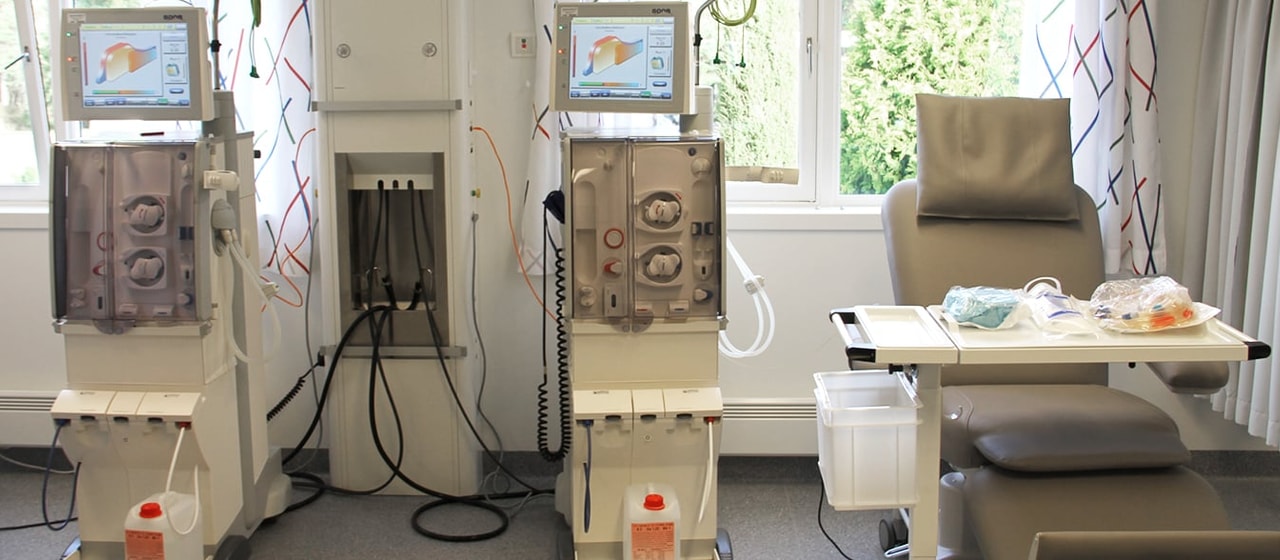 18168 Aluflex Dialysis 18168Due to its constant recurrence, blood dialysis is a laborious process for patients. The design of Alu- flex dialysis system focuses on the comfort or the patient while simplifying the treatment, fading the technology into the background for a more pleasant care environment. The vertical installation is completely free from the walls and the dialysis columns can be placed anywhere in the room. In between window, or back to back this flexibility enable’s the staff to work freely over the surfaces. Space in the dialysis column has been provided for wiring and electrical outlet sockets, pipes and connection to medical gases, while the vertical connection has also enabled the integration of pipes and taps for dialysis water and drainage.