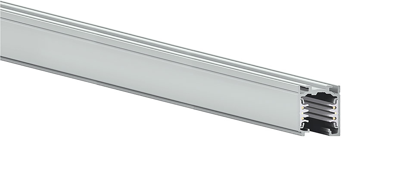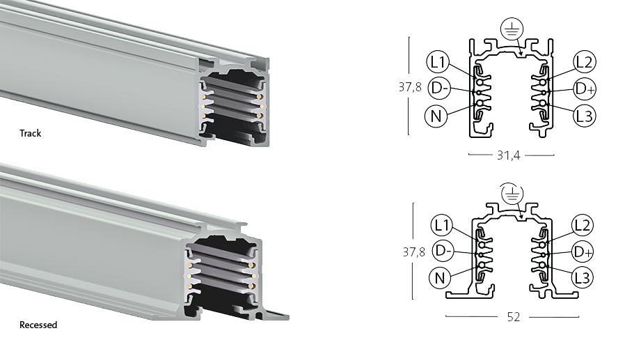 Control Track is a 6 circuit track with, 3 phases, 2 control wires, 1 neutral wire and with a protective earth, designed for 230V, 3x16A current max 3,68 kVA. It supports DALI on the 2 integrated control wires.