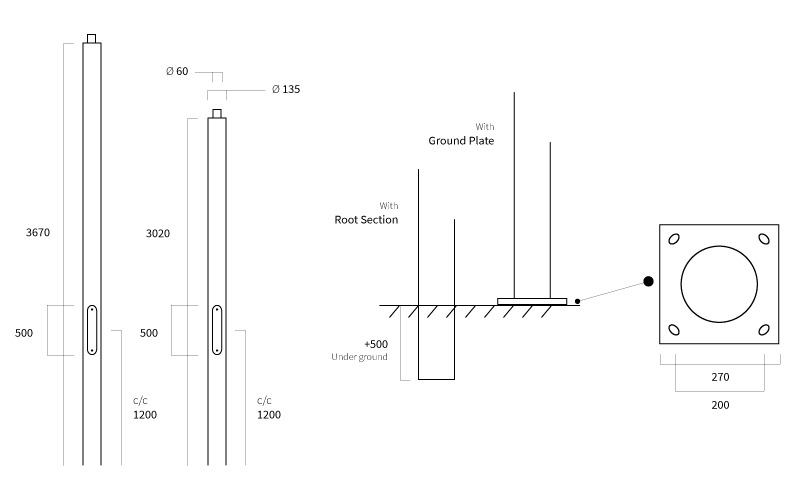 Straight cylindrical post for mounting on a base plate or foundation. The diameter is the same from the base to the top of the post.