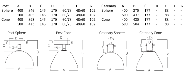 Kuppel af opal akryl eller lakeret trykdrejet aluminium i standardfarver. Enhver farve på forespørgsel. Stolpebeslag i stål. Hærdet planglas. Fastgørelseselement i A4-kvalitet med zinkbehandling. Øvrige detaljer i støbt aluminium.