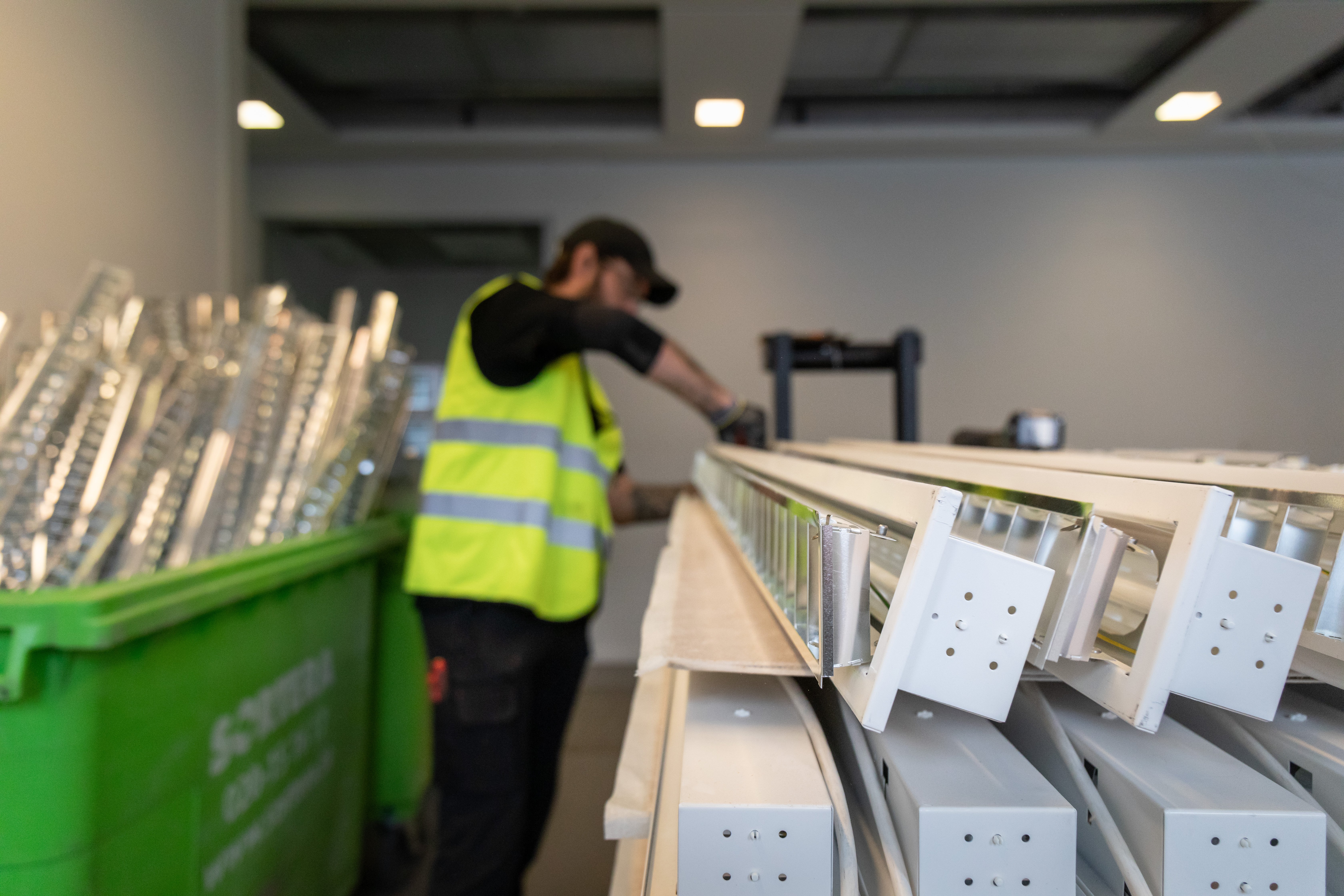Fagerhult etablerede en fuldskala produktionslinje på Greenhouse, hvor opsætning og arbejdsflow blev planlagt i tæt samarbejde med de lokale elektrikere. Alt blev tænkt igennem – fra nem transport af armaturerne indendørs til test og genanvendelse af materialer.