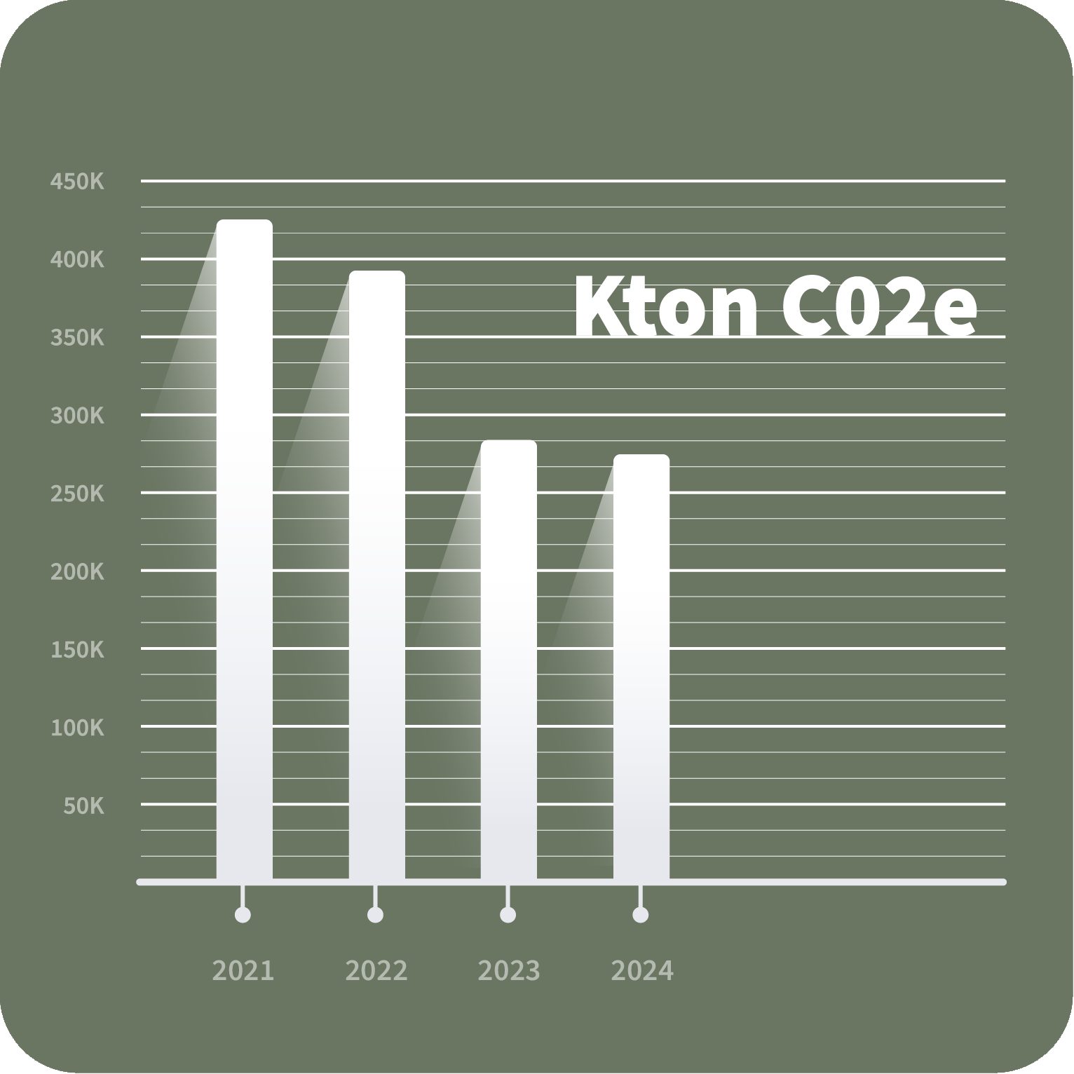 In den Grafiken stellen die grünen Balken eine lineare Reduzierung der Emissionen seit unserem Basisjahr 2021 bis zum Jahr 2030 dar. Dies entspricht der Reduktionsrate, die wir benötigen, um unsere Ziele in diesem Zeitraum zu erreichen. Die weißen Balken zeigen das tatsächliche Ergebnis für jedes Jahr.