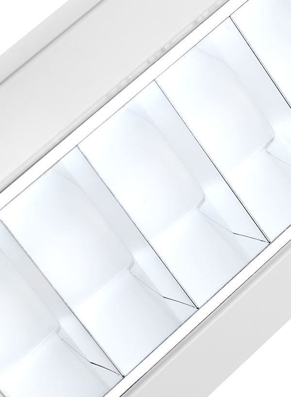 Beta Opti is based on a modified r5 cross-blade that, in combination with side reflectors and a diffusing film, provides complete control of the luminous flux. The efficiency has gone from 70 lm/W (T5) to approx. 120 lm/W and the aim is to achieve an even better value. The louvre has two different modules: one with direct light and one with an advanced combination of direct and wide-beam indirect light.