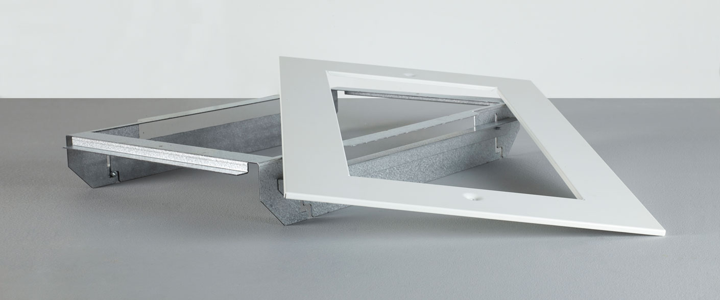 Châssis de luminaire en aluminium moulé (RAL 9016). Cadre anti-éblouissement en aluzinc laquée.