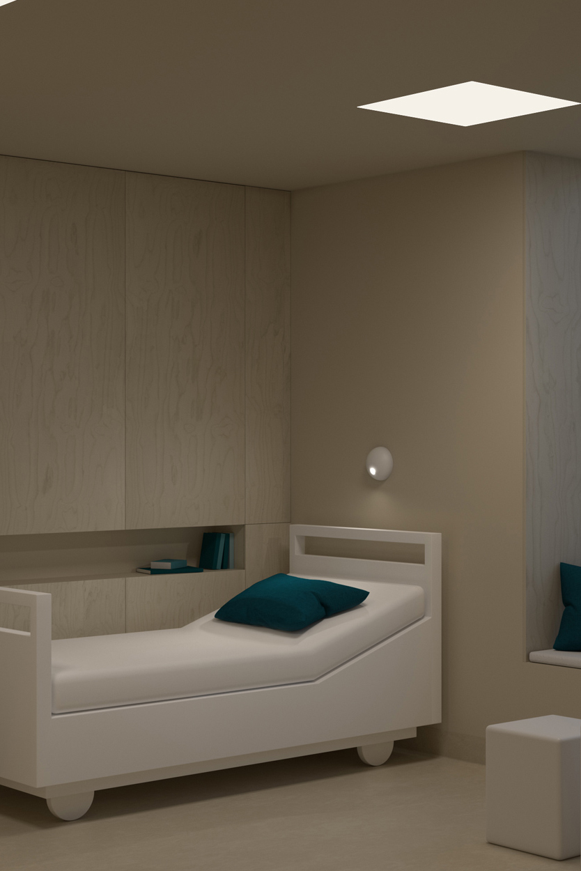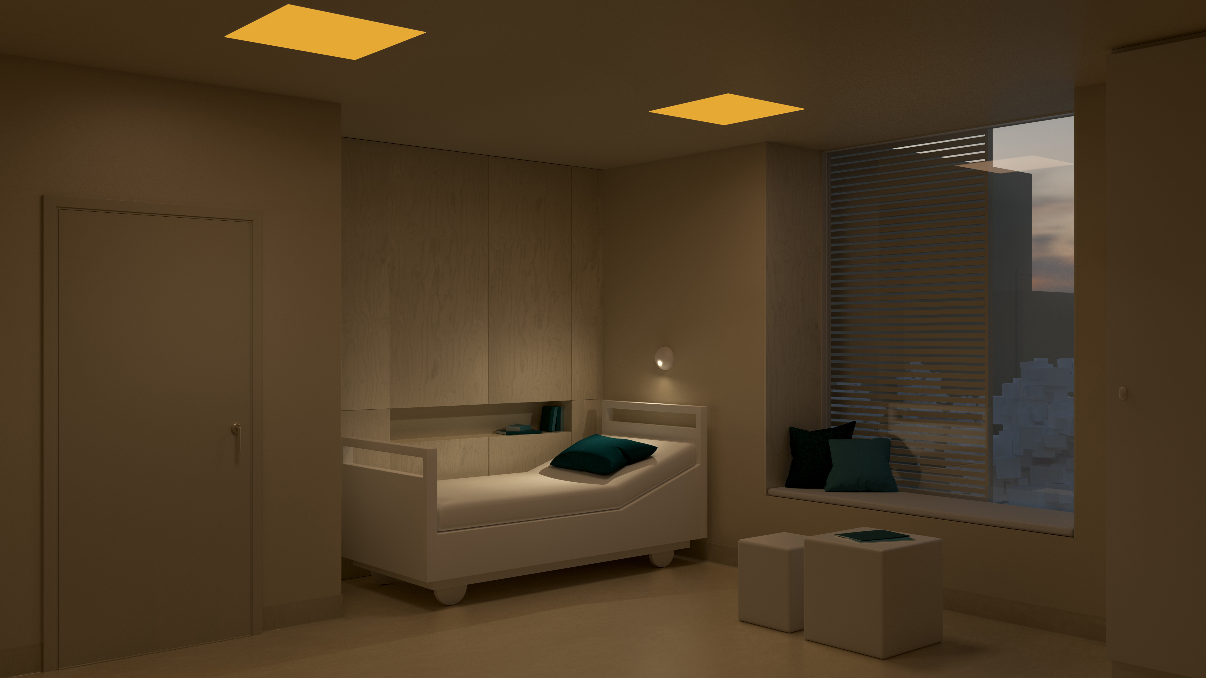 In general, subdued, warm lighting is perceived as more relaxing and soothing than lighting with a strong luminous flux and high colour temperature. Our solution makes use of Amber as, for example, a night-time orientation light. Filtering out particular colours, mainly within the blue and green ranges of the spectrum, and instead emphasising the red stimulates the body's melatonin production, making us want to sleep. This helps to maintain a natural circadian rhythm and creates a sense of calm for the patient.