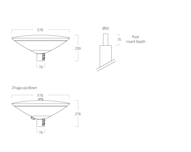 Zhaga – Zhaga-fitting omhoog en omhoog/omlaag. In het geval van Zhaga omhoog/omlaag is de grootte van de node voor de omlaag-fitting beperkt tot ⌀ 75 mm.