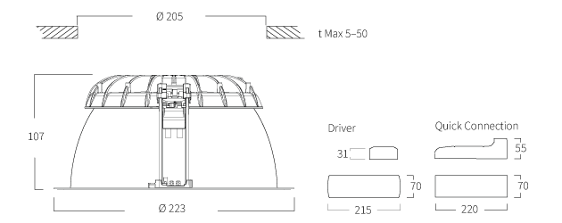Aansluiting in/met afzonderlijke vsa./LED driver Snelkoppelingsklem 3 x 1,5 mm² (x2), doorverbinden mogelijk. 5 x 1,5 mm² (x2) bij lichtregeling. Kan ook worden geleverd met een op het frame gemonteerde snelkoppeling in de vsa/LED driver, waar ruimte is voor een T-splitter of een geaarde aansluitkabel en stekker. Armatuurframe en driver worden op elkaar aangesloten met een snelkoppeling.