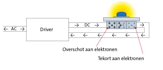 LED is een afkorting van Light Emitting Diode, dat wil zeggen een lichtdiode. De lichtdiode is een halfgeleider die het vermogen heeft licht uit te stralen wanneer hij elektrisch gestimuleerd wordt (dit wordt elektroluminescentie genoemd). De lichtdiode wordt aangedreven met gelijkstroom, DC, en daarvoor is meestal een aparte voeding of een “driver” nodig. De voeding zet de netspanning om naar een niveau dat optimaal is voor de lichtdiode.