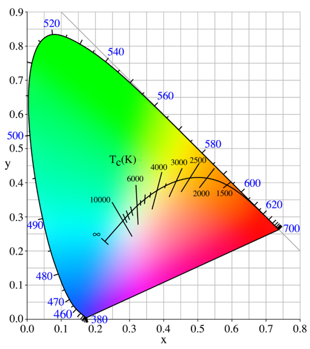Lichtkleur en kleurtemperatuur maken deel uit van de kleurendriehoek. Een ander deel van de kleurendriehoek is de Plankiaanse locus. Deze staat ook bekend als de Black Body Locus (BBL) en geeft kleurtemperaturen aan (in Kelvin) en komt overeen met de werkelijke kleur van een verwarmd zwart lichaam. Hoe hoger de kleurtemperatuur, hoe meer gloeiend het lichaam is. Bij gloeilampen is de kleurtemperatuur gelijk aan de werkelijke temperatuur (°K) van de gloeidraad. Omdat moderne lichtbronnen geen gloeidraden hebben, wordt in plaats daarvan een gecorreleerde kleurtemperatuur (CCT) aangegeven. Deze wordt gemeten aan de hand van de chromaticiteit van de lichtbron waar een van de isothermen* de curve van Plank kruist. *Isotherm: een lijn die punten met dezelfde temperatuur verbindt.