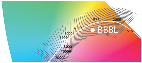 Zoals u in het gedeelte hierboven over kleurtemperatuur kunt lezen, beschrijft de Planckiaanse Locus (Black Body Locus) het witte licht in de kleurendriehoek. Normaal gesproken leveren onze producten licht met een kleurencoördinaat op het snijpunt van de curve en de isothermische lijnen van kleurtemperatuur. Voor sommige toepassingen, voornamelijk bij winkelverlichting, hebben we ervoor gekozen om een specifiek kleurencoördinaat te ontwikkelen dat net onder de Planckiaanse locus (BBBL - Below Black Body Locus) ligt. Deze kleurencoördinaat werd gekozen omdat het ons nog steeds een warm wit licht oplevert (normaal 3000 K), maar ook een "witter" wit. Onze BBBL producten bieden ook een zeer goede kleurweergave (CRI > 90) en verbeteren contrasten.