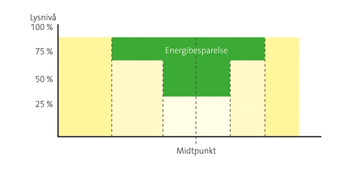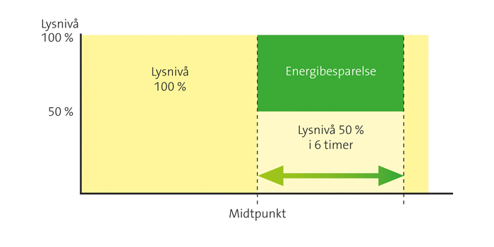 Systemet beregner midtpunktet for den lyssyklusen anlegget er tent og regulerer deretter ned fra 100 prosent til 50 prosent i 6 timer fra midtpunktet. Når 6 timer er gått, reguleres anlegget opp igjen til 100 prosent. Energibesparelse: Inntil 20 prosent.