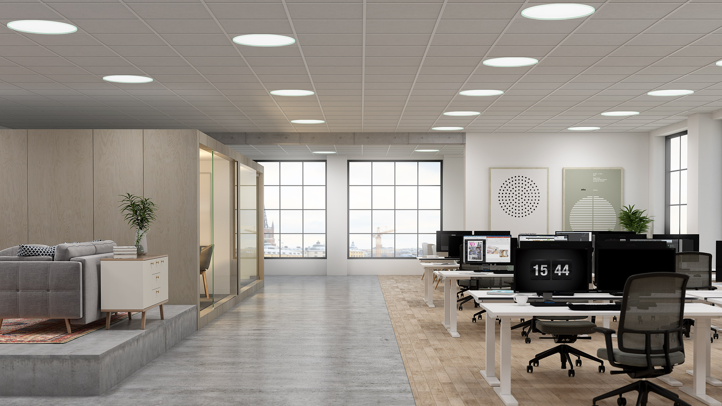 Med en effektiv avskärmning av LED-plattan, till exempel med tillbehöret Compago eller Fence, minskas den synliga ytan av armaturen, när man ser den på avstånd och sänker medelluminansen. Detta ger ett mer behagligt allmänljus i lokalen. Dessutom blir taket mer livligt och gör det lättare för ögat att navigera i, än en helt jämn takyta.
