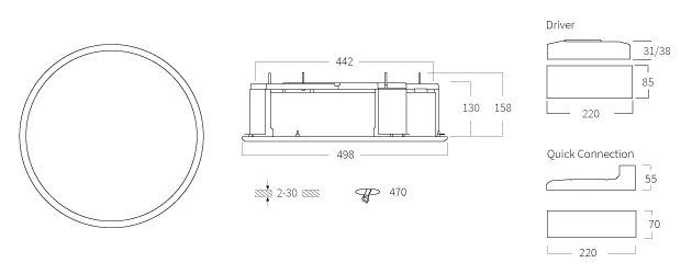 Infällning i undertak. Oventilerad alt. ventilerad byggnadsdel. Stabilt montagesystem ingår. Vid montage i mjuka tak ska montageplåt användas, se tillbehör. Driftdonsboxen är separat för flexibelt och snabbt montage.