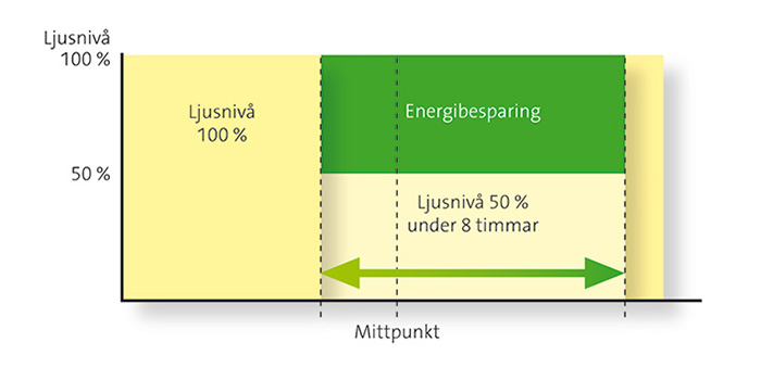 Systemet räknar ut mittpunkten av den ljuscykel anläggningen är tänd och reglerar sedan ner från 100 procent till 50 procent under 6 timmar från mittpunkten. När 6 timmar har gått regleras anläggningen upp till 100 procent igen. Energibesparing: upp till 20 procent.