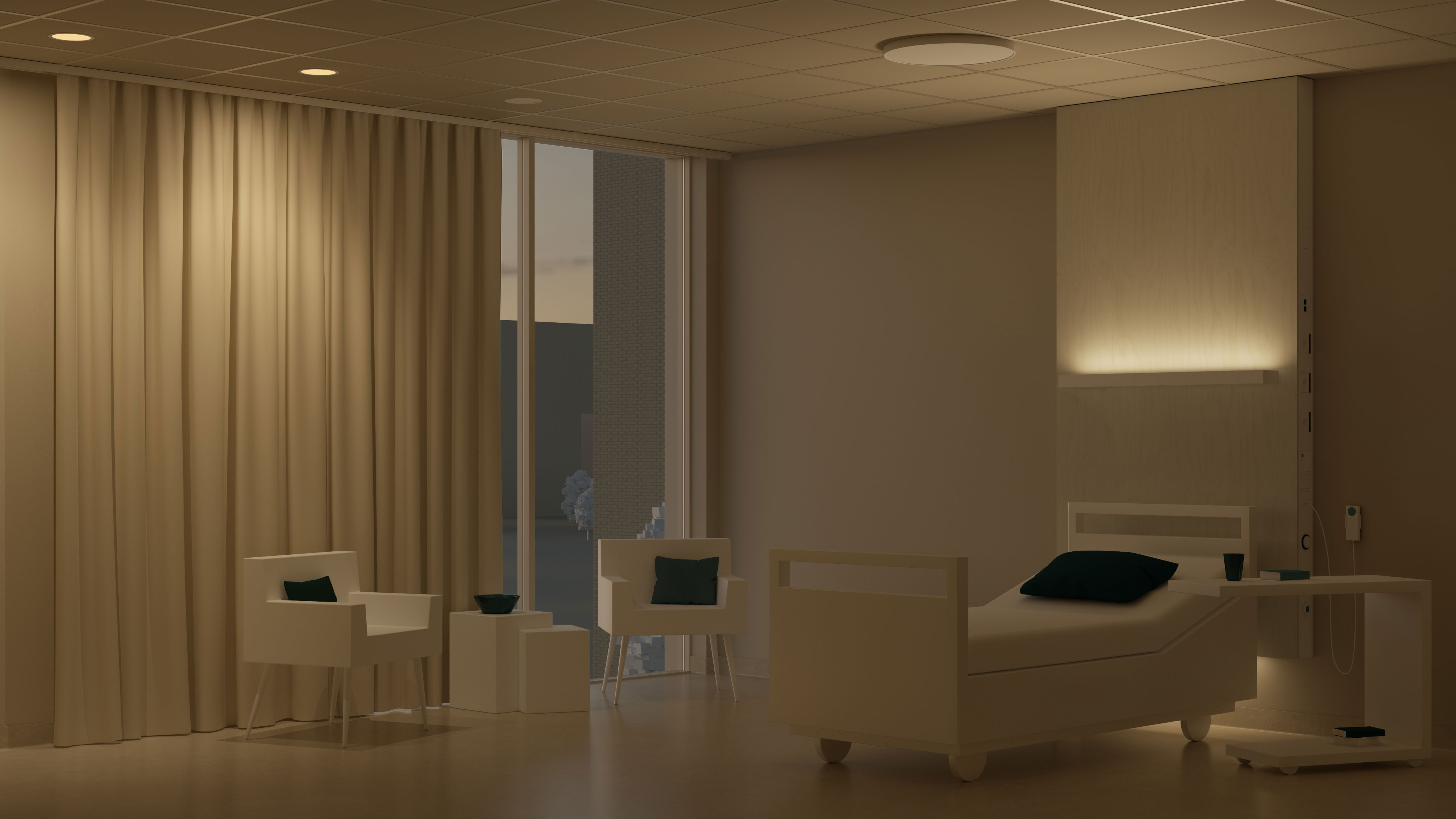 Det individuella patientrummet kan ibland bli en miljö som är patientens fasta punkt under en traumatisk eller turbulent tid. Det är därför viktigt att rummet blir en så harmonisk plats som möjligt. I rummet ska ibland avancerad teknisk utrustning samsas med möjligheten att slappna av och umgås med sina anhöriga. Därför är en del av belysningens roll i vårdrummet att skapa en trygg och behaglig miljö, som på bästa sätt främjar läkande och återhämtning. Belysningen ska kunna skapa möjligheten att på bästa sätt bibehålla dygnsrytmen och skapa ett rumsligt sammanhang för den som vistas där.